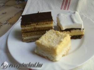 Hozzávalók: Tészta: 6 tojásfehérje 20 dkg cukor 10 dkg finomliszt 10 dkg kókuszreszelék Tepsi kikenéséhez: vaj, finomliszt Krémhez: 6 tojássárgája 1 csomag vaníliás pudingpor 4 dl tej 25-30 dkg cukor 25 dkg margarin Tetejére: 5 dkg kókuszreszelék mogyoró Elkészítése: A tojásfehérjéket kemény habbá verjük, a vége felé apránként a cukrot is hozzáadjuk. A lisztet a […]