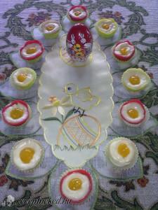 Hozzávalók: 30 dkg marcipán ételfesték 0,5 dl kókusztejszín 10 dkg fehér csokoládé 5 dkg vaj 2 dkg kókuszreszelék 10 dkg mascarpone 1 dl tojáslikőr 5 dkg hidegen kötő vaníliás pudingpor Elkészítése: A marcipánt tetszőleges színre színezzük, kb. 20 db 1,5 dkg-os „fél tojáshéjakat” formázunk, és kis mignon kapszliba helyezzük. A krémhez a kókusztejszínt forrásig melegítjük […]