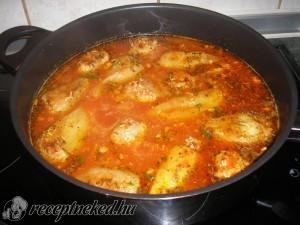 Hozzávalók: 8 db fehér húsú paprika 60 dkg darált sertéslapocka 1 fej vöröshagyma 2 gerezd fokhagyma 1 tojás fűszerpaprika só bors 2 evőkanál rizs 0,5 liter sűrített paradicsom cukor víz metélőhagyma oregánó Elkészítése: A darált húst sóval, borssal, paprikával, tojással, reszelt hagymával és a fokhagymával, meg a rizzsel összedolgozzuk és a megtisztított, kicsumázott paprikákba töltjük. […]