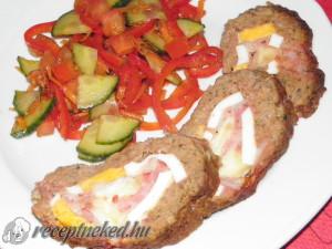 Hozzávalók: 60 dkg pulykahús (darálva) 1 szikkadt zsemle 1 ek étolaj 1 vöröshagyma 1 tojás 3 gerezd fokhagyma 1 tk oregánó 1 tk bazsalikom 1 tk borsikafű Töltelék: 10 dkg sajt 3 főtt tojás 10 dkg bacon szalonna só őrölt bors Elkészítése: A pulykahúst (mell, felső comb) ledaráljuk a vöröshagymával és fokhagymával együtt. Hozzáadjuk az […]