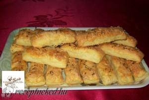 Hozzávalók: Tésztához: 50 dkg finomliszt 25 dkg túró 1 tk só 25 dkg margarin 2 tojássárgája 2 dl tejföl Tetejére: 1 felvert tojás 15 dkg reszelt sajt 1 tk egész kömény Elkészítése: A lisztet átszitáljuk, összekeverjük a sóval, majd a margarinnal elmorzsoljuk. Hozzáadjuk a tojássárgákat és az áttört túrót is. Jól kidolgozzuk, szép sima legyen […]