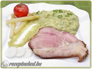 Hozzávalók: 2 szelet füstölt főtt sonka (kötözött is lehet) A spárgapüréhez: 250 g fehér spárga 1 csomag újhagyma frissen őrölt só bors 3 merőkanál alaplé (csont, hús, zöldség) 1 pohár natúr joghurt (150 g) 1 ek étkezési keményítő 1 kk citromlé kevés olívaolaj (vagy napraforgó) Elkészítése: Az ujjnyi vastag sonkaszeleteket serpenyőben, vagy grillrácson, esetleg sütőben […]