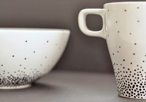 Porcelán festő tollal, vagy deco-painter tollal pöttyözz bögréket! Ez előbbieket a sütőben érdemes kiégetni, ez utóbbiakat nem szükséges, de azok nem is lesznek gépben mosogathatók.