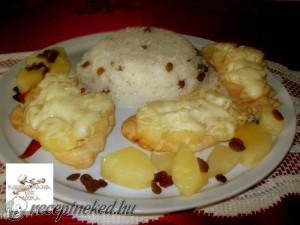 Hozzávalók: 0,5 kg csirkemellfilé 1 doboz ananász konzerv 10 dkg trappista sajt reszelve só ízlés szerint őrölt bors ízlés szerint 10 dkg vaj az ananász befőtt leve Körethez: 1 ek olívaolaj 1 bögre rizs 2 bögre víz 5 dkg mazsola Elkészítése: A tepsit kivajazzuk, az ananászról leszűrt levet a tepsibe öntjük. A csirkemell szeleteket kiklopfoljuk, […]