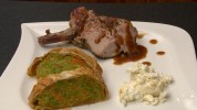 Erdei gombás-póréhagymás libamájpástétom-szív fekete sópihével, hagyma és fügelekvárral, konfitált-sült borjúgerinc sült fetahabbal, barna mártással és zöldséges rétessel, csokoládé-láva házi vanília fagylalttal, karamell és csokoládé öntettel