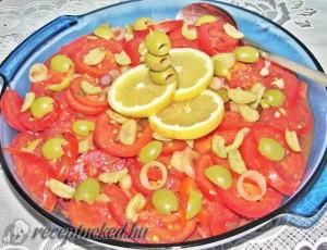Hozzávalók: 3 kg paradicsom 1 csomó lila újhagyma 200 g magozott olajbogyó 1 citrom leve kevés friss kapor kevés friss bazsalikom levél, kevés só kevés frissen őrölt bors 2 kanál extra szűz olíva olaj Elkészítése: A paradicsomokat felszeletelem, majd megöntöm olíva olajjal. Ha az elején olajjal fürdetem meg a paradicsomot, akkor a sózás hatására nem […]