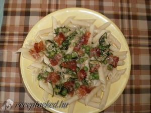Hozzávalók: 40 dkg penne tészta 40 dkg zöldborsó 10 dkg parmezán vagy más sajt reszelve 3 evőkanál olaj 5 dkg dióbél ízlés szerint só 5 dkg bacon felkockázva petrezselyemzöld 2 cikk fokhagyma Elkészítése: A tésztát megfőzzük, majd leszűrjük. A bacont csíkokra vágjuk és kisütjük. Közben megfőzzük zöldborsót sós vízben, majd leszűrjük és botmixerrel pépesítjük, egy […]