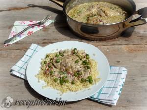 Hozzávalók: 2 csirkecomb 15 dkg bacon 3-4 újhagyma 2 gerezd fokhagyma 25 dkg zöldborsó 2 dl tejföl só őrölt bors szerecsendió kakukkfű majoránna 2 db zöldségleves kocka 2,5 dl víz ízlés szerinti mennyiségű bulgur, enyhén sós vízben kifőzve Elkészítése: A combokat vágjuk ketté, a bacont kockázzuk fel, az újhagymát és a fokhagymát vékonyra szeleteljük fel. […]