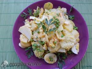 Hozzávalók: 60 dkg burgonya 30 dkg zöldborsó 5 főtt tojás 4 tojás 3 dl tejföl 2 gerezd zúzott fokhagyma só ízlés szerint 30 dkg kolbász 4 ek napraforgó olaj Elkészítése: A burgonyát héjastól megfőzzük, leszűrjük, megpucoljuk, és felkarikázzuk. A zöldborsót sós vízben megfőzzük, majd leszűrjük. 5 tojást megfőzünk, megpucoljuk, és felkarikázzuk. Egy tálba felverünk 4 […]