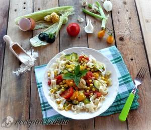 Hozzávalók: 20 dkg házi metélt tészta 1 db zsenge cukkini 1 cső főznivaló kukorica 1 cs újhagyma 2-3 gerezd fokhagyma 3-4 db paradicsom só őrölt bors ételízesítő bazsalikom 2 ek olívaolaj 1 dl víz Elkészítése: Az újhagymát vágjuk fel kicsit vastagabb karikákra. A fokhagymát és a bazsalikomot vágjuk fel apróra. A cukkinit gyaluljuk le vékonyra. […]
