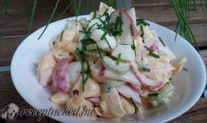 Hozzávalók: 50 dkg (gm) kagylótészta 4 halványító zeller 4 keményre főtt tojás 8 db hónapos retek 0,5 kígyó uborka 3 ek majonéz 1 kis pohár (lm) natúr joghurt 1 fél citrom leve 3 ek friss aprított snidling só frissen őrölt fehér bors Elkészítése: A tésztát enyhén sós, lobogó vízben a csomagoláson található utasítások szerint kifőzzük, […]
