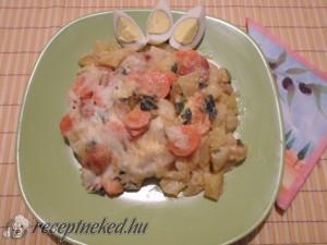 Hozzávalók: 1 kg burgonya 4 közepes sárgarépa 4 közepes újhagyma 6 főtt tojás 30 dkg kolbász só bors 5 ek napraforgó olaj 2,5 dl tej 3 gerezd fokhagyma 2 tk mustár 10 dkg sajt 2 dl víz Elkészítése: A burgonyát héjában megfőzzük, megpucoljuk, és felkockázzuk. Olajon megpirítjuk a felkarikázott kolbászt,hozzáadjuk a felkarikázott újhagymát zöldjével együtt, […]