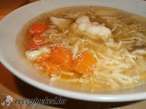 Hozzávalók: 1 kis zeller 2-3 sárgarépa 2-3 fehérrépa 1 kisebb karfiol 2 burgonya 2 húsleveskocka 1 fej vöröshagyma 1 evőkanál liszt étolaj víz Elkészítése: A zöldségeket megtisztítjuk, kisebb darabokra vágjuk. A karfiolt rózsáira szedjük. A vöröshagymát apróra vágjuk, egy kevés olajon megdinszteljük a zöldségekkel együtt, kivéve a karfiolt, azt később rakjuk a levesbe. Megszórjuk 1 […]